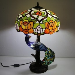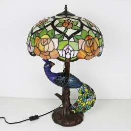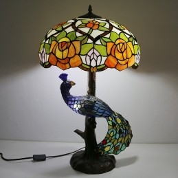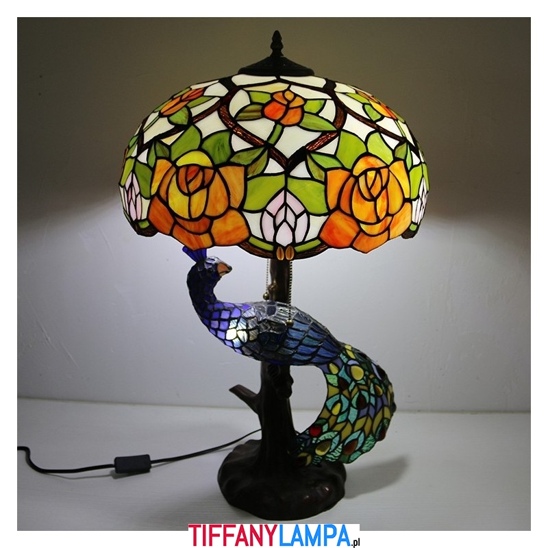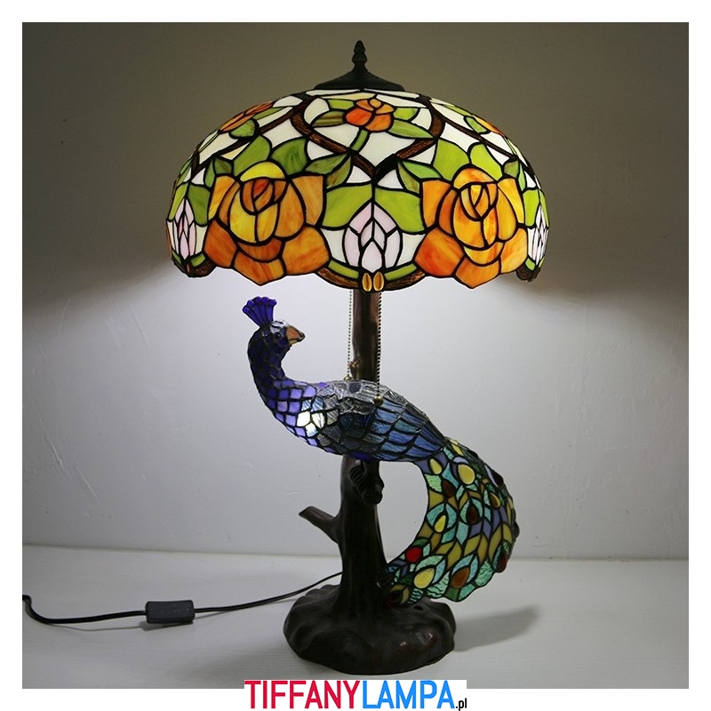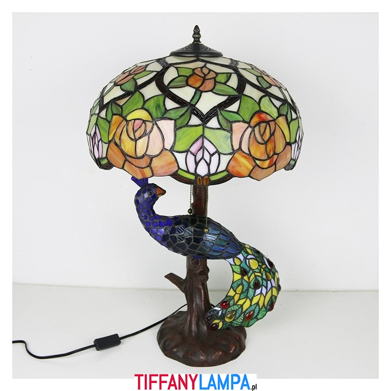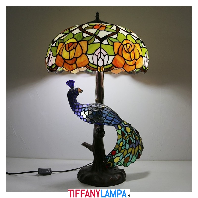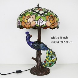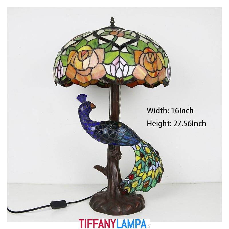 16-calowa lampa biurkowa z kloszem w kształcie róży Lampa stołowa w stylu Tiffany'ego ze szklanym pawiem i podstawą drzewa
